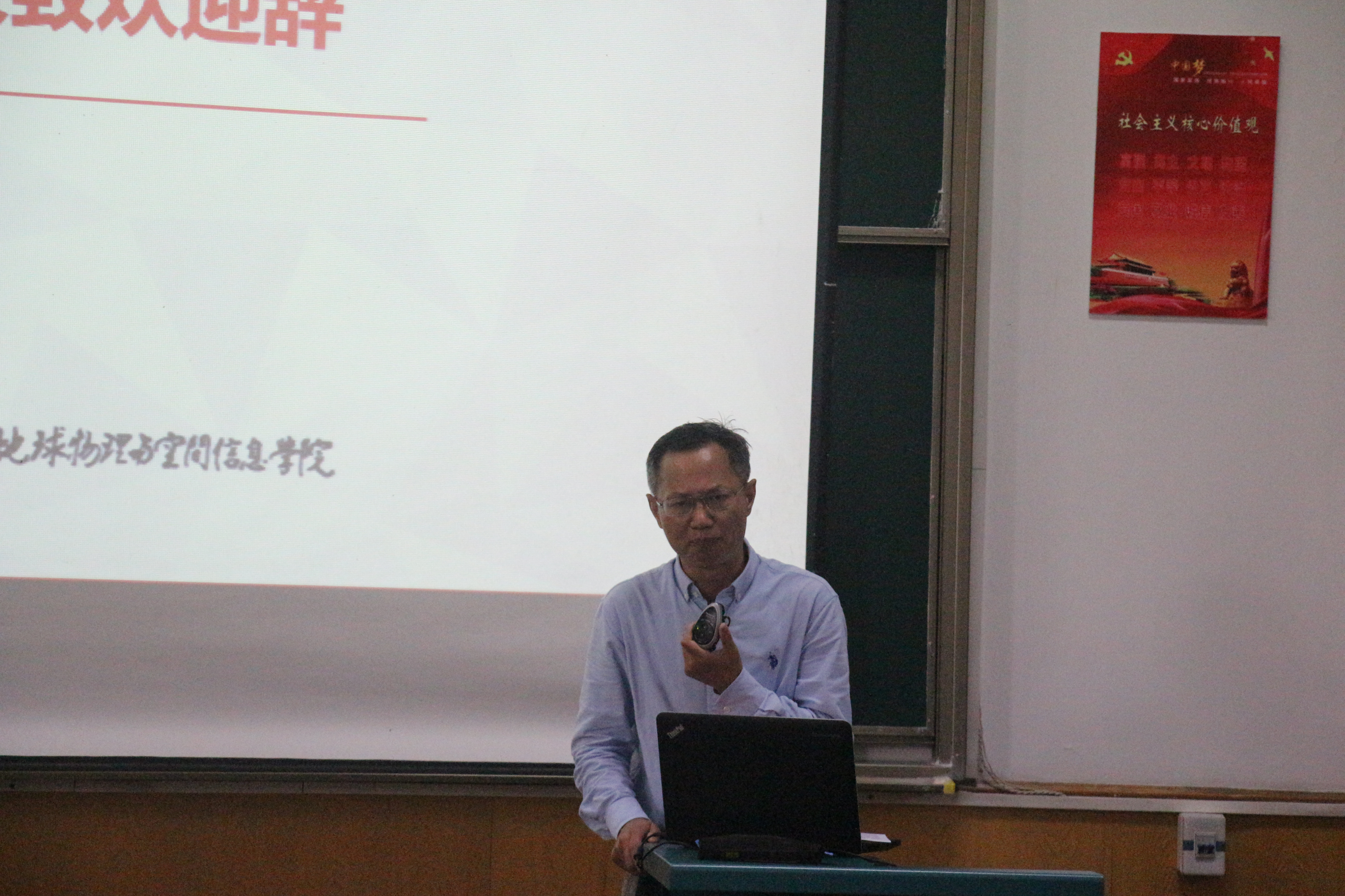 胡祥云院长致欢迎词。胡院长首先表达了对新生们的热烈欢迎,欢迎他们加入地空,成为一个物探人。他以风趣的语言、具体的实例,向新生们传授大学生活的经验。胡院长还提醒同学们,进入大学并不意味着放松,而是一段新征程的开始,希望同学们规划好大学生活,时刻秉承“艰苦朴素,求真务实”的校训,做一个目标明确、志存高远的优秀大学生。