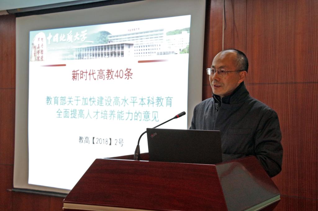 党委书记刘子忠对全体教师提出了三点要求:一是要认真学习领悟习近平总书记与陈宝生部长重要讲话,认真学习学校相关政策;二是提高思想认识,办人民满意的教育;三是排查教学中的问题,将“以本为本、四个回归、严在地大”落到实处。